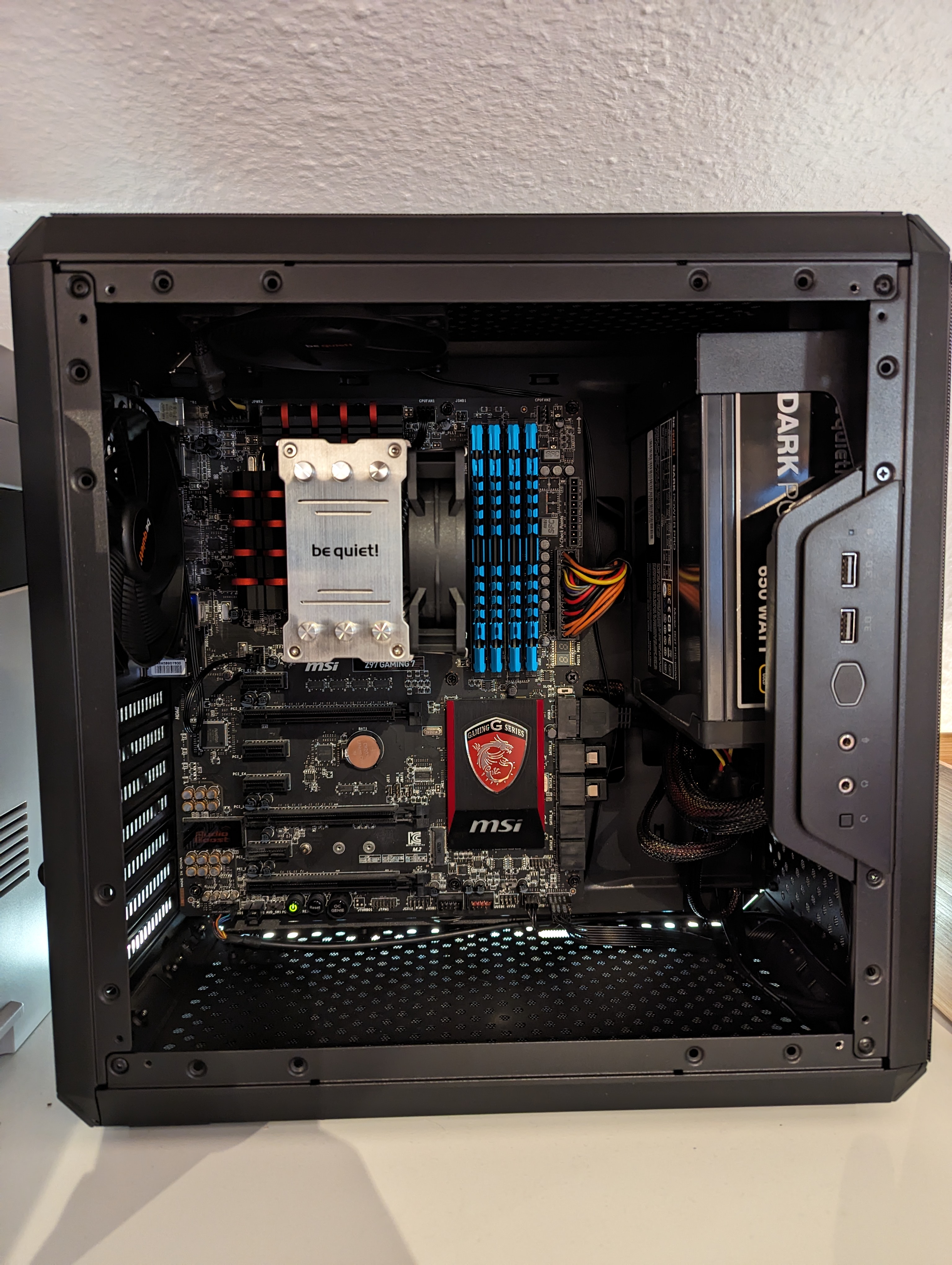 Es lässt sich also zusammenfassen: Gutes Preis-Leistungs-Verhältnis. Für knapp 70€ (+9€ für einen ordentlichen Lüfter!) seid ihr dabei und erhaltet ein praktisches Gehäuse, um den lieben alten PC Komponenten neues Leben einzuhauchen. Achja, eine normal große Grafikkarte passt natürlich auch rein, bei mir werkelt aber nur die gute alte Onboard Grafik meines alten Intel Core i7. Die Beleuchtung ist übrigens nicht dabei, sondern zugekauft (für 11€ bei Amazon).